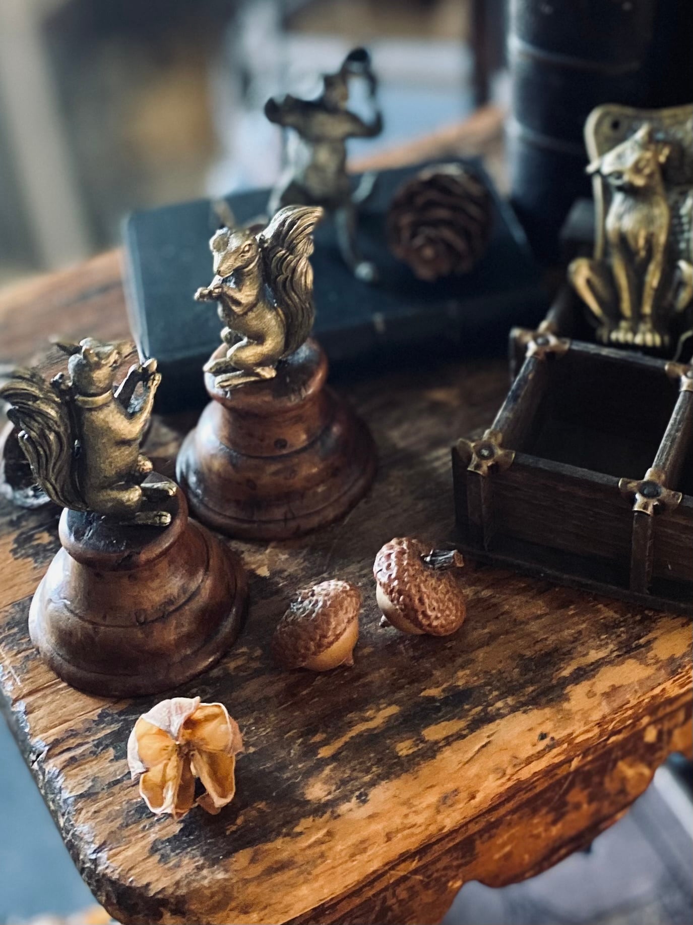 どんぐりを手に物思いにふけるリスさん、食べようか頬袋に取っておこうか考えあぐねているのでしょうか。なんともファニーな表情です。