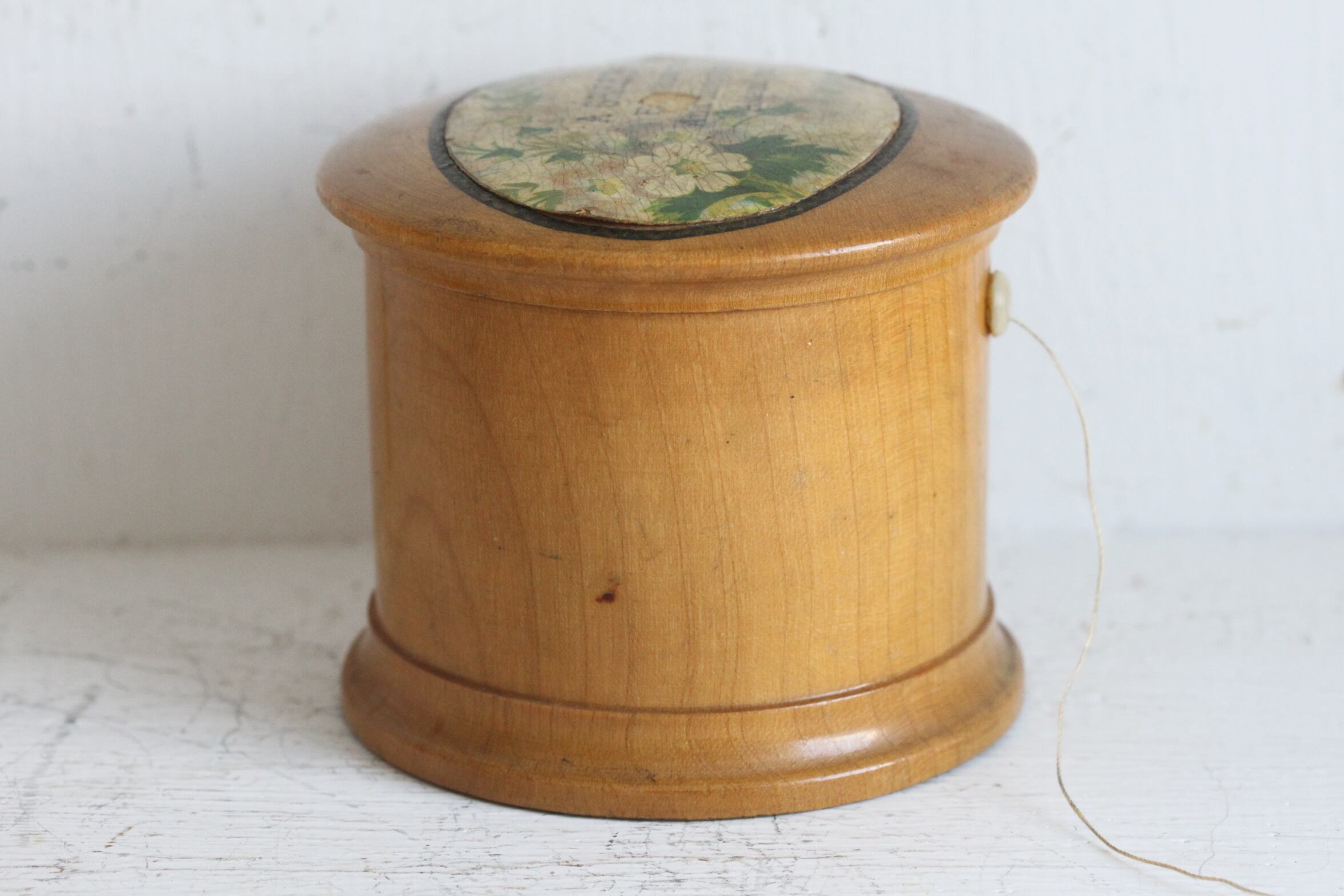 デコパージュ部分に貫入と剥げが見られますが使用に差し支えるものは無く蓋の開閉も糸出しもスムーズです。
