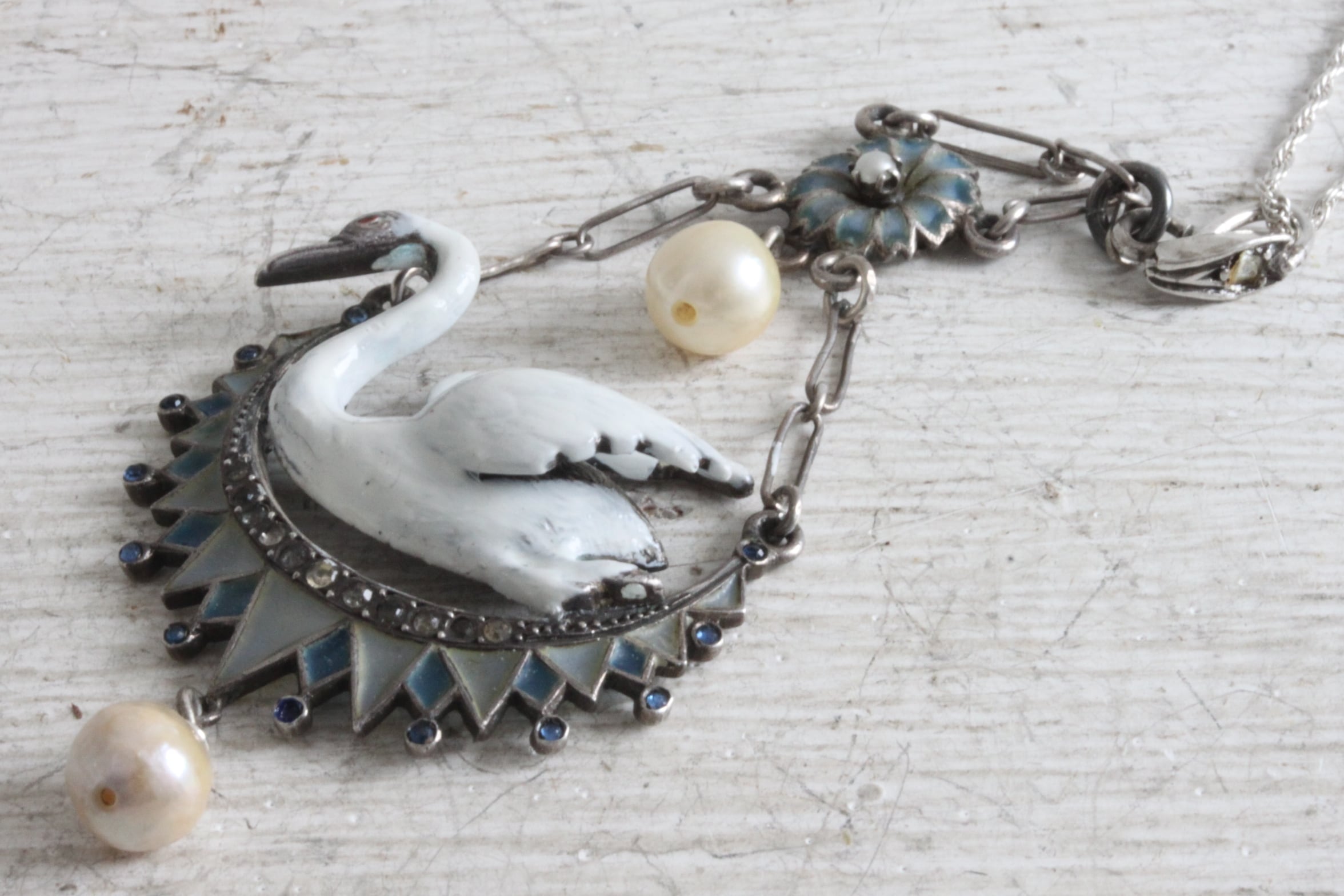 今回ご紹介するお品はエナメルの立体スワンを包むようにブルーグレーと乳白色のプリカジュールエナメルを施し、上部にもお花型のプリカジュールがあしらわれています。