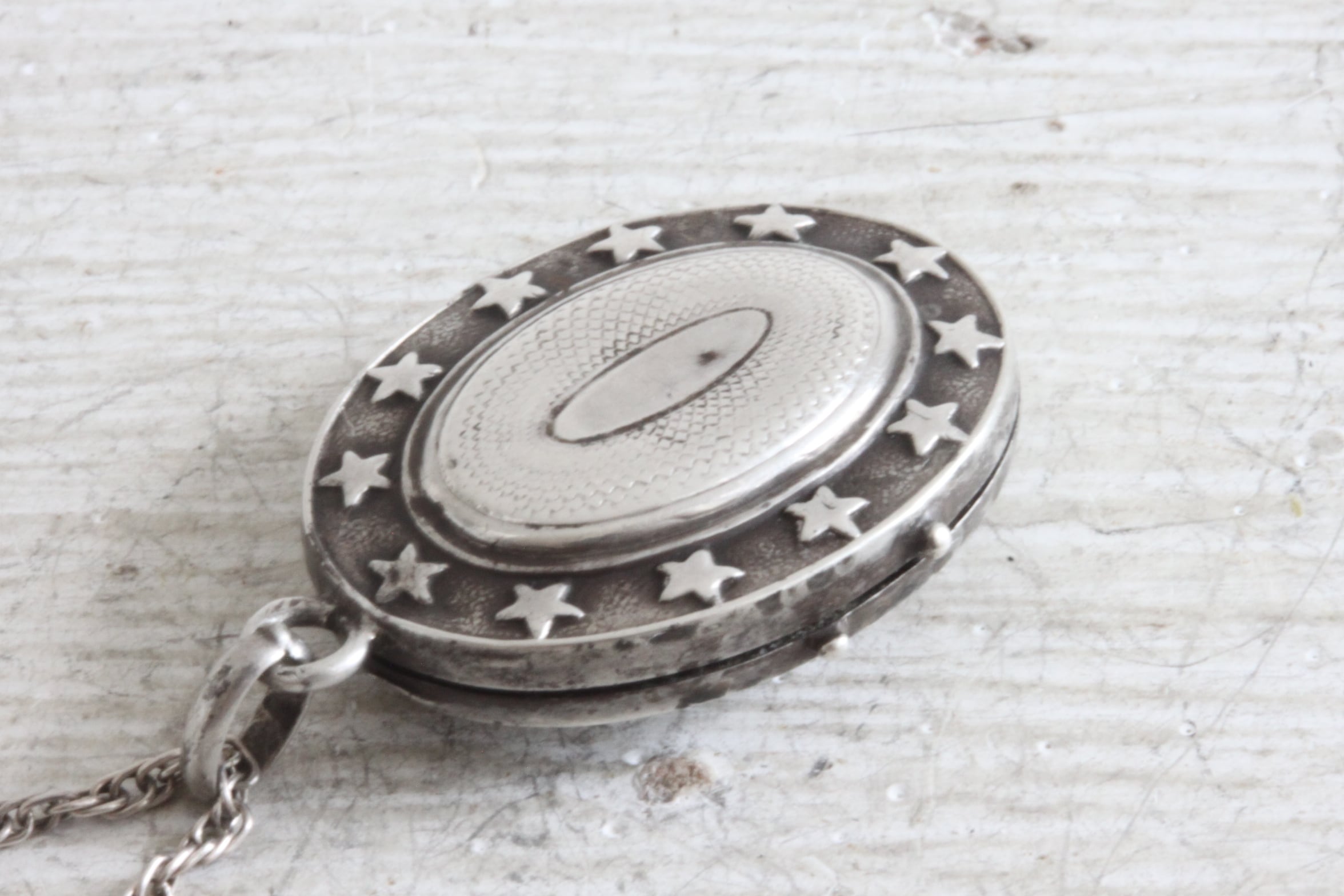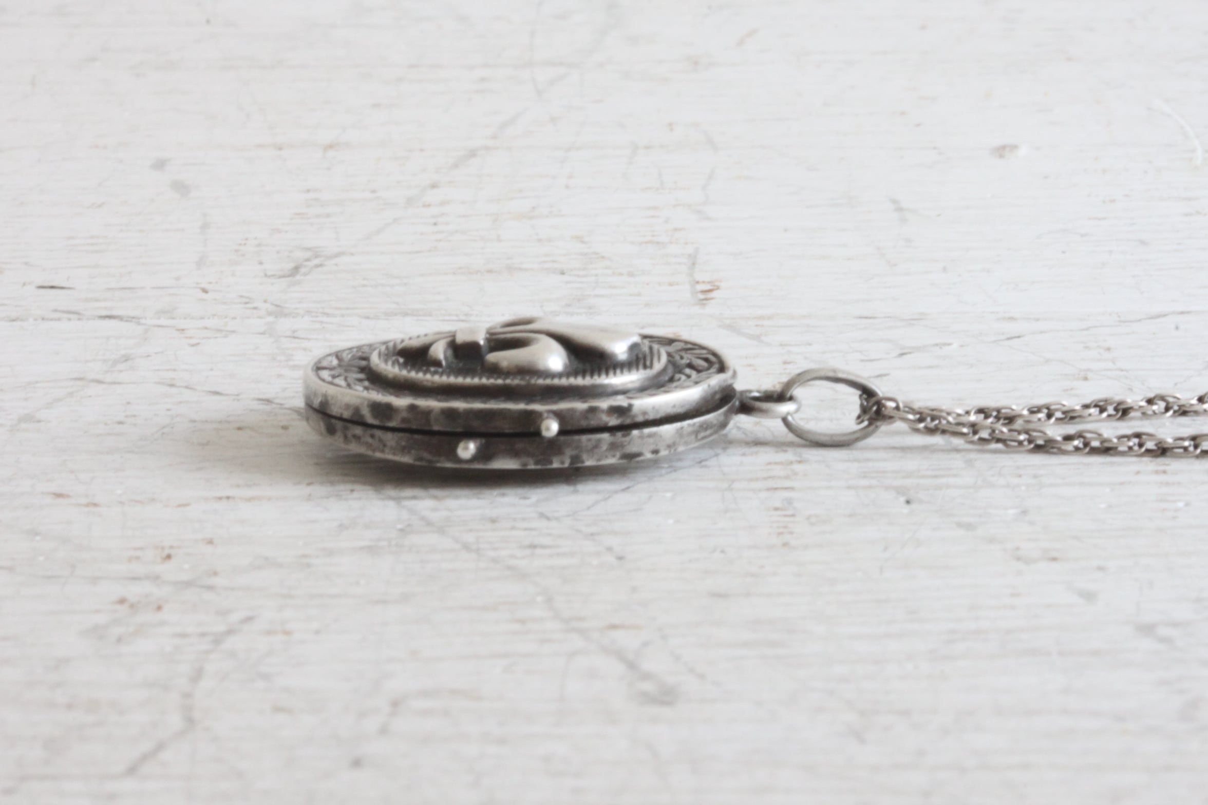 チェーンが付属されていませんでしたのでイギリス製のアンティークシルバーチェーンをセッティングしています。