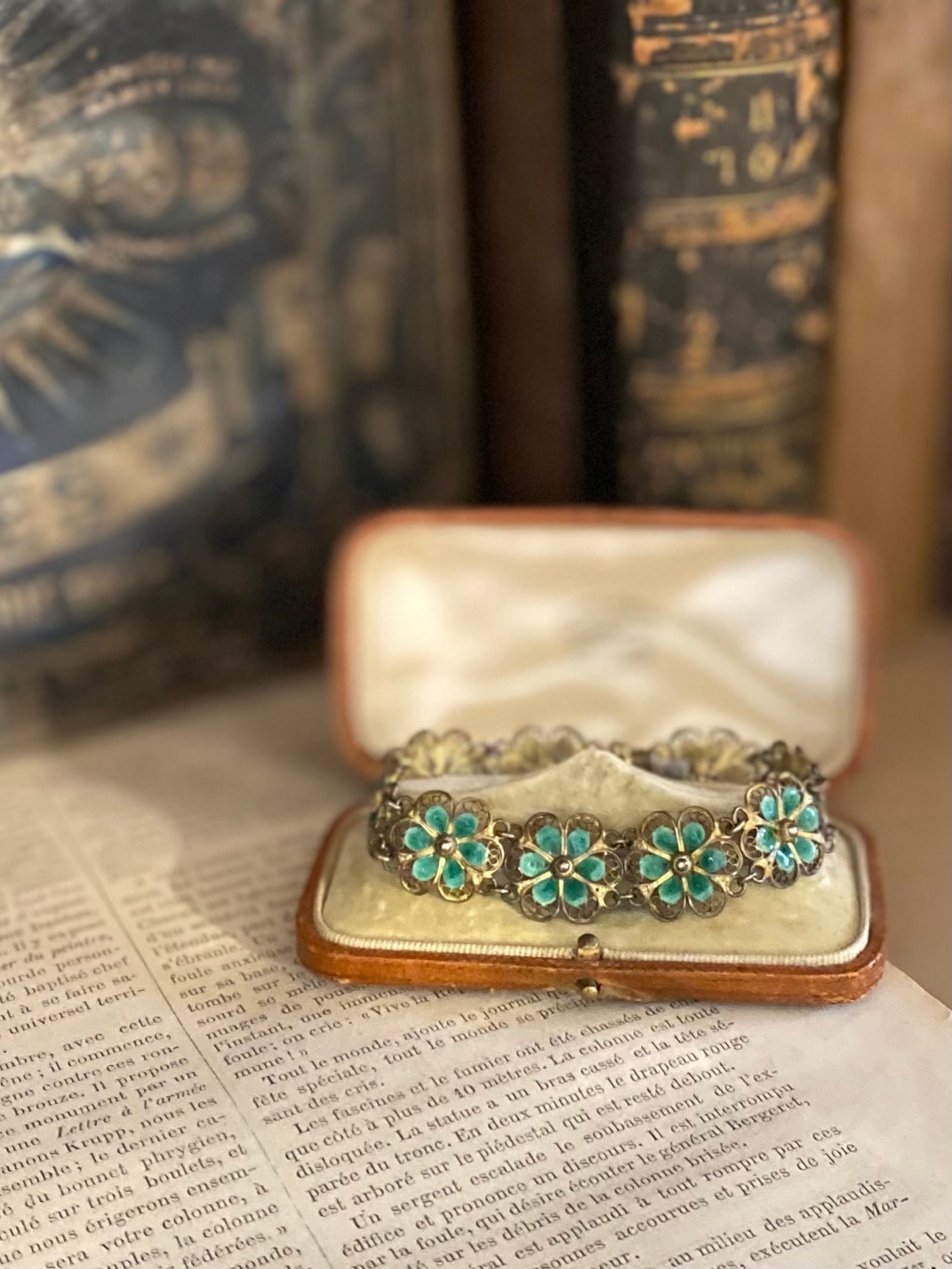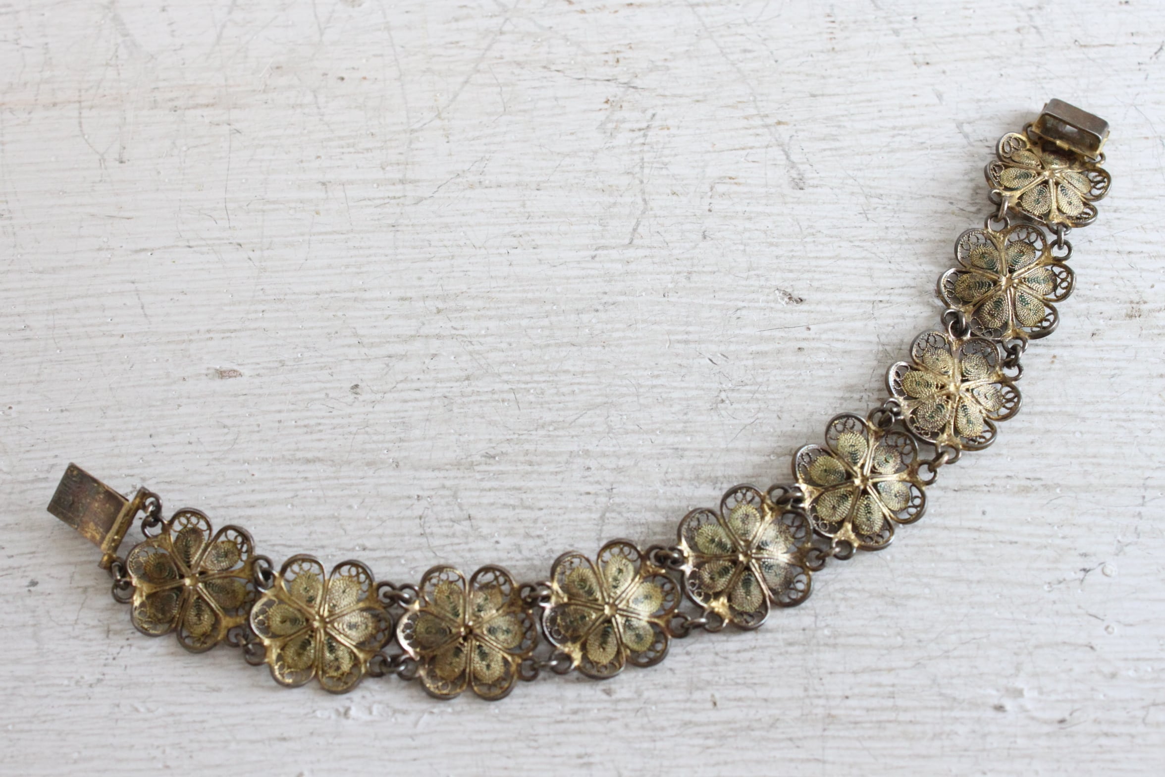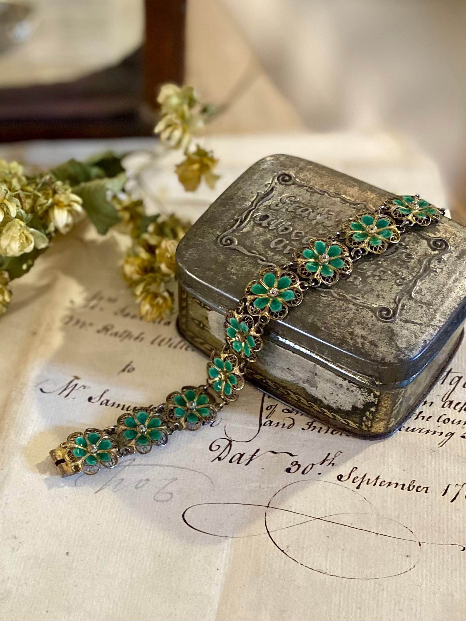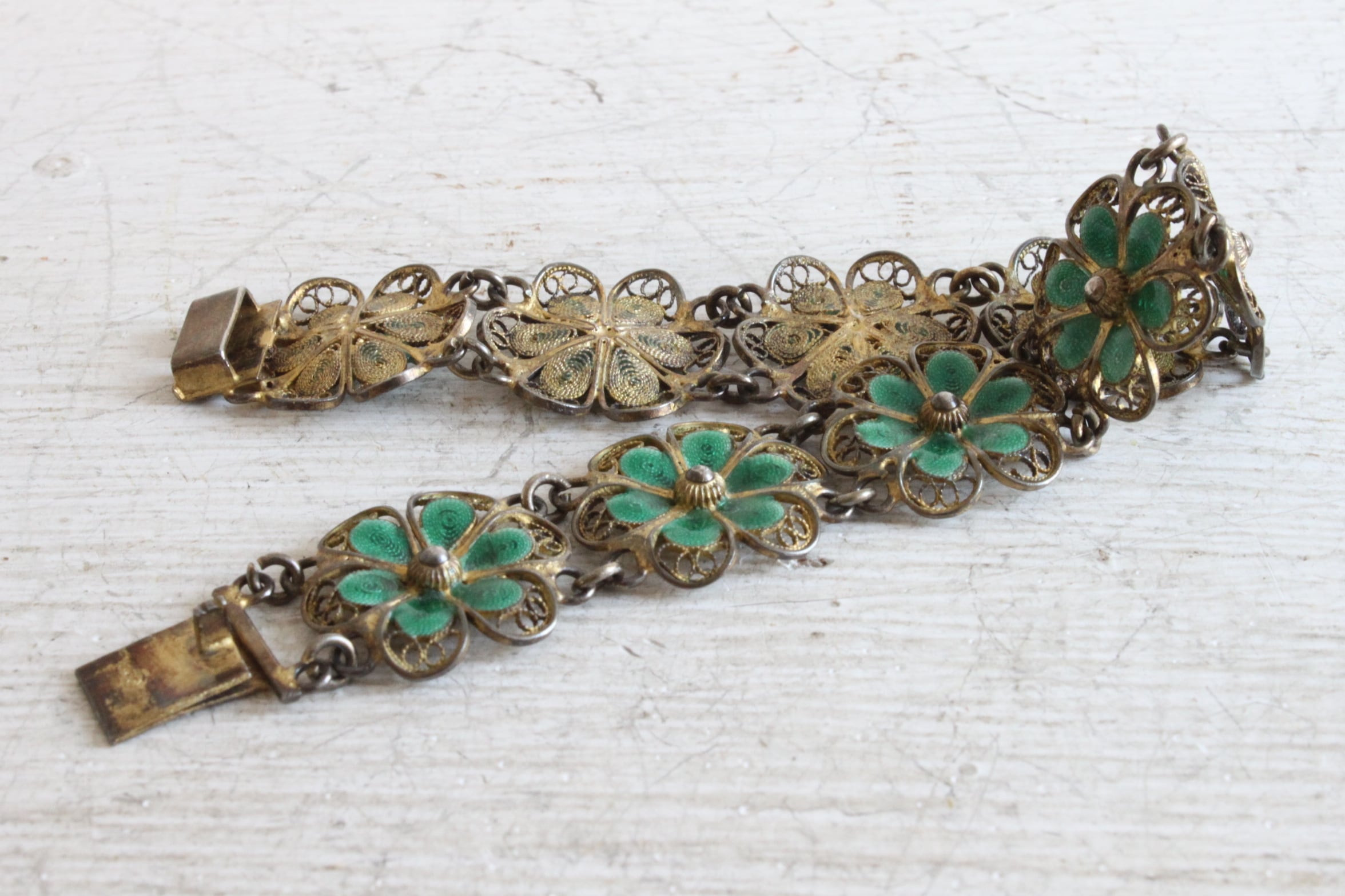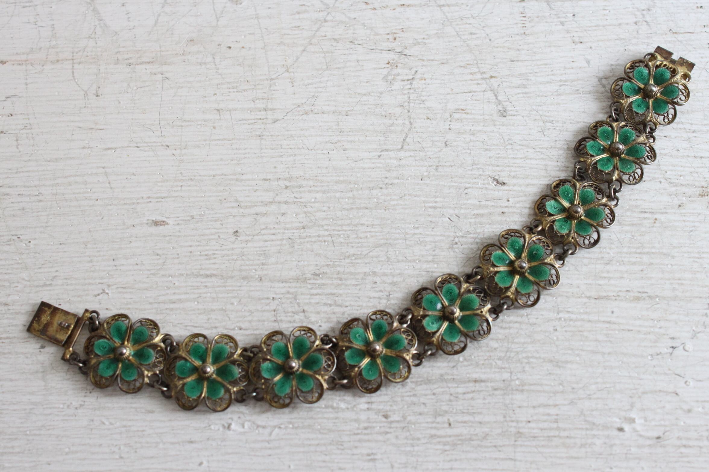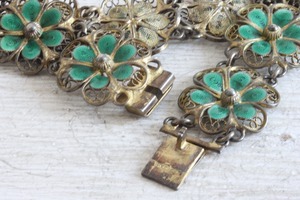 透かしが美しいシルバーのフィリグリーワークに、グリーンのエナメルが綺麗なブレスレット。