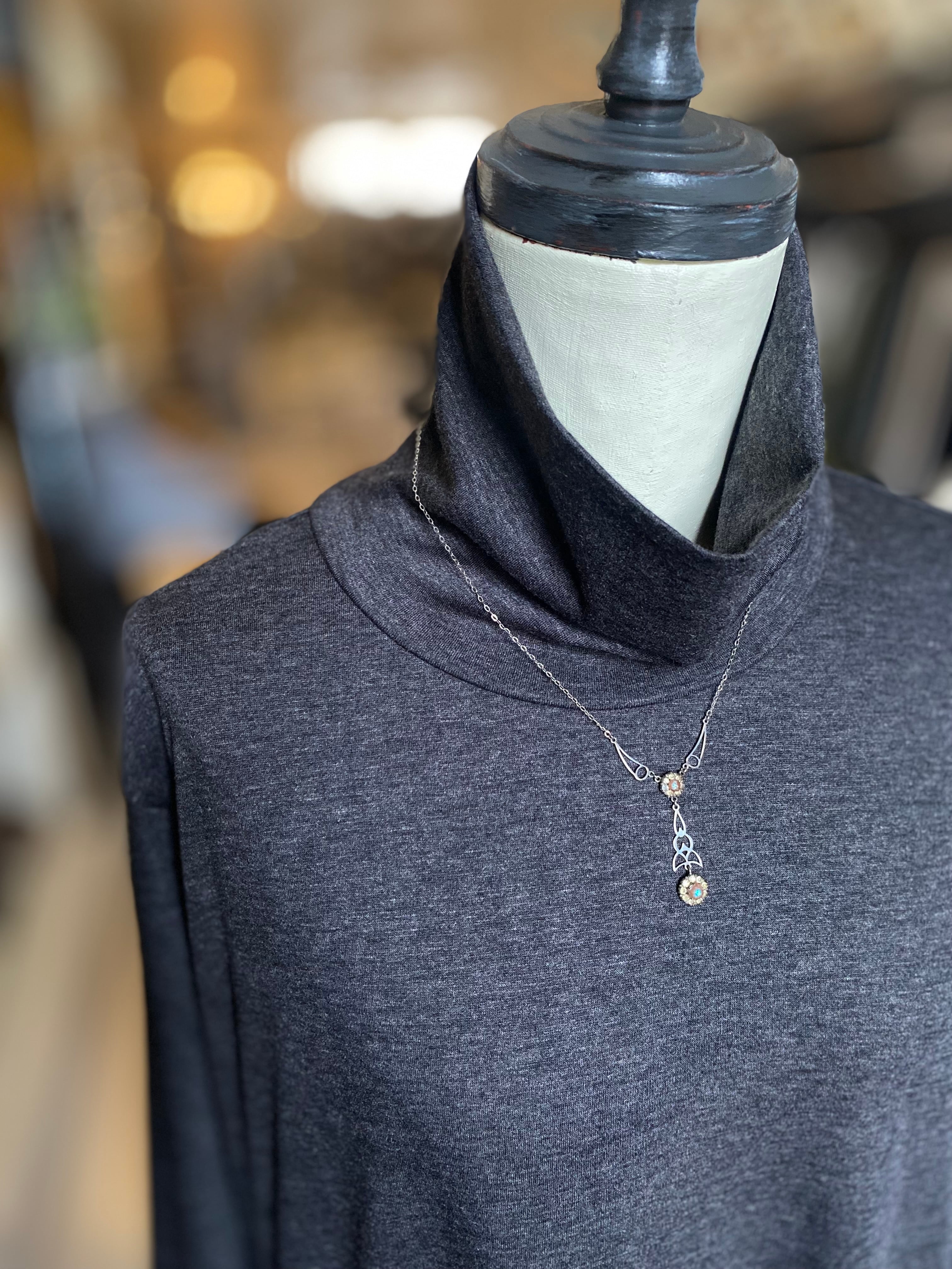 スッと縦にさがったデザインがデコルテも美しく印象付けます。