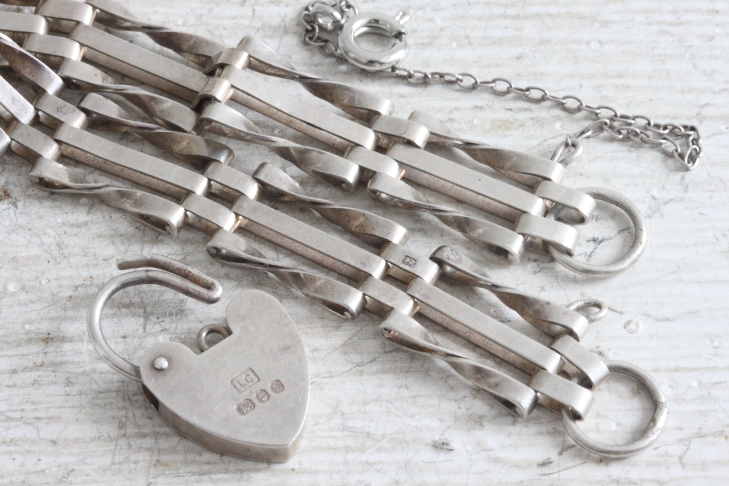 ゲートブレスレットと呼ばれるチェーンで、3本のバーを繋ぎ合わせて作られています。